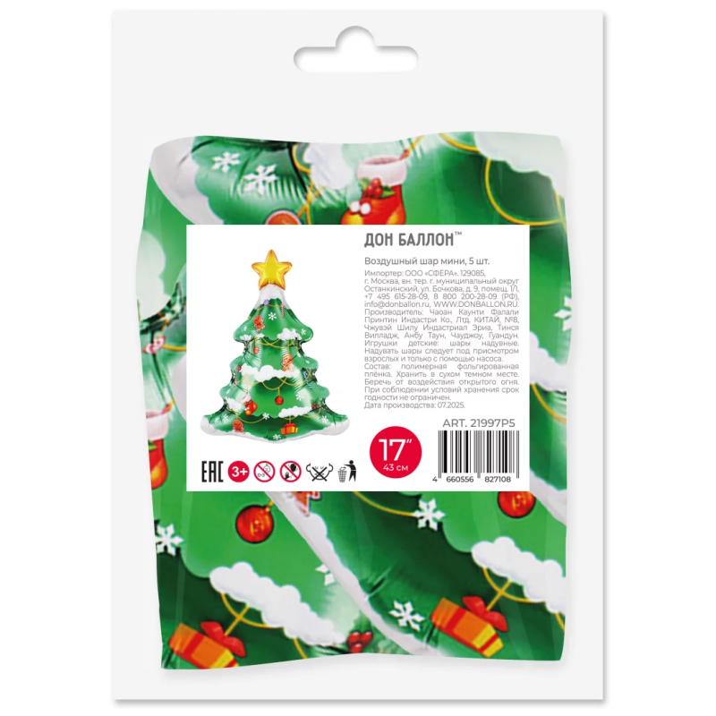 Шар с клапаном (17''/43 см) Мини-фигура, Новогодняя елочка со снегом, 5 шт. в уп., 21997P5