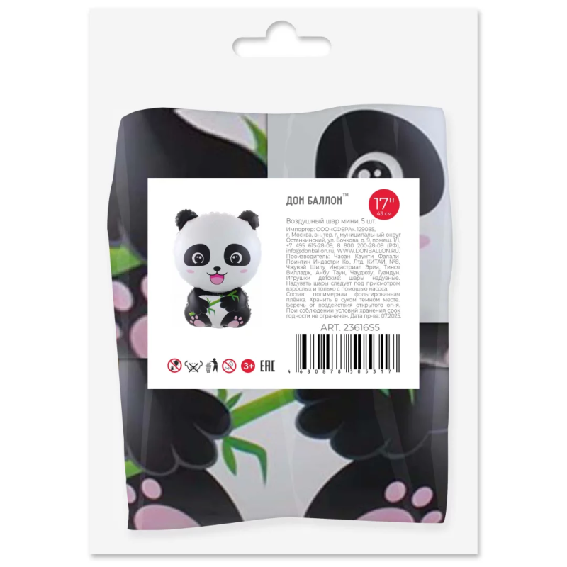 Шар с клапаном (17''/43 см) Мини-фигура, Панда, 5 шт. в уп. (цв.этик.), 23616S5