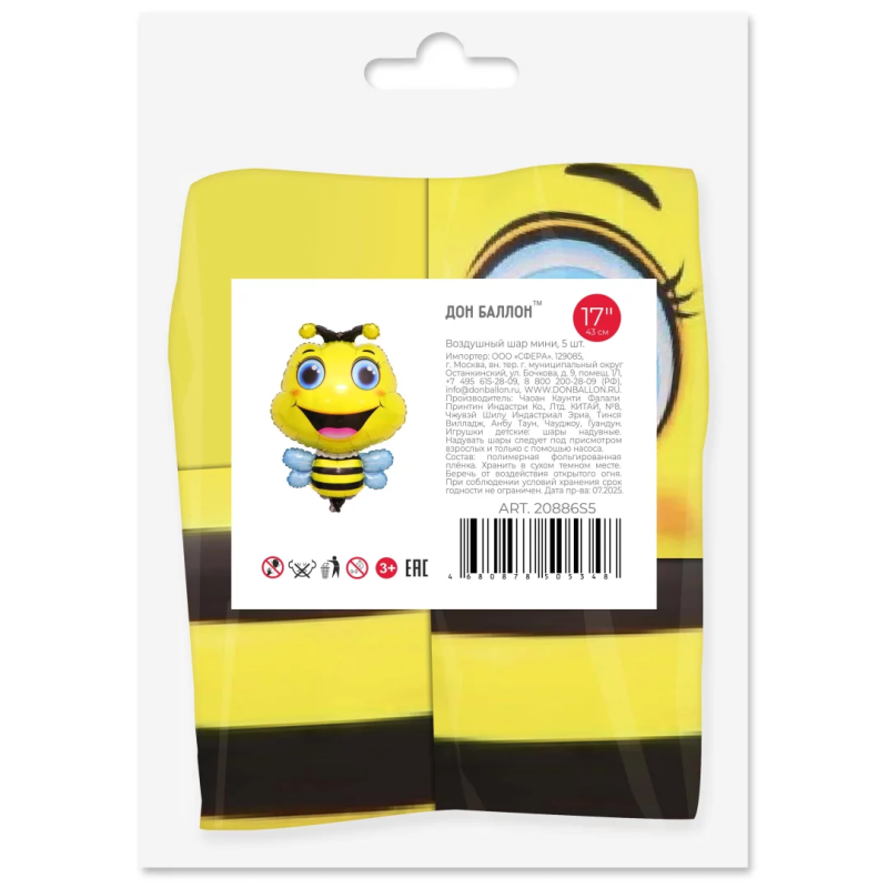 Шар с клапаном (17''/43 см) Мини-фигура, Счастливая пчела, 5 шт. в уп. (цв.этик.), 20886S5