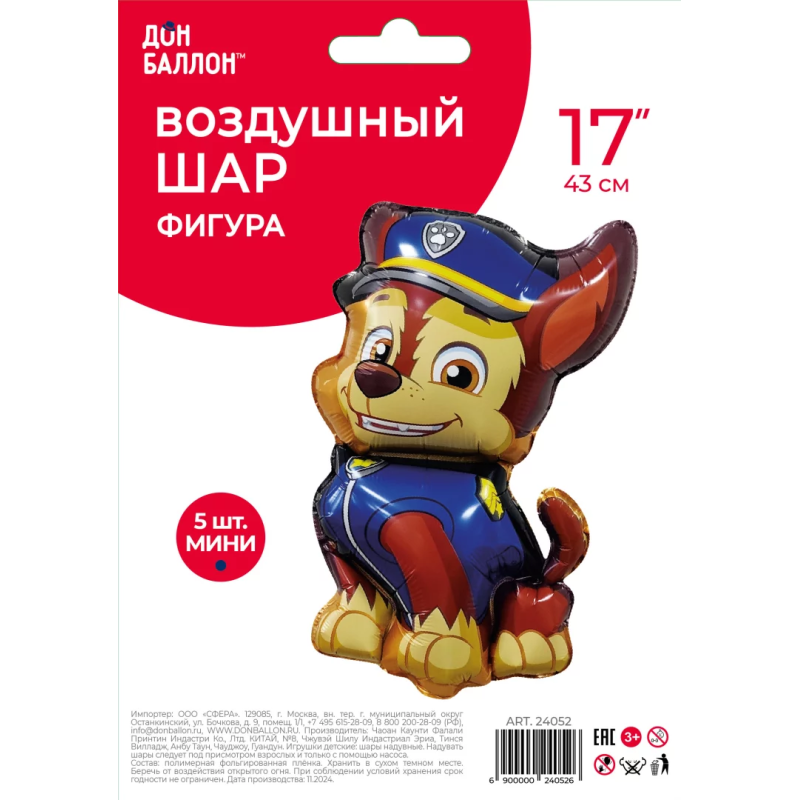 Шар с клапаном (17''/43 см) Мини-фигура, Щенок Полицейский, 5 шт. в уп., 24052