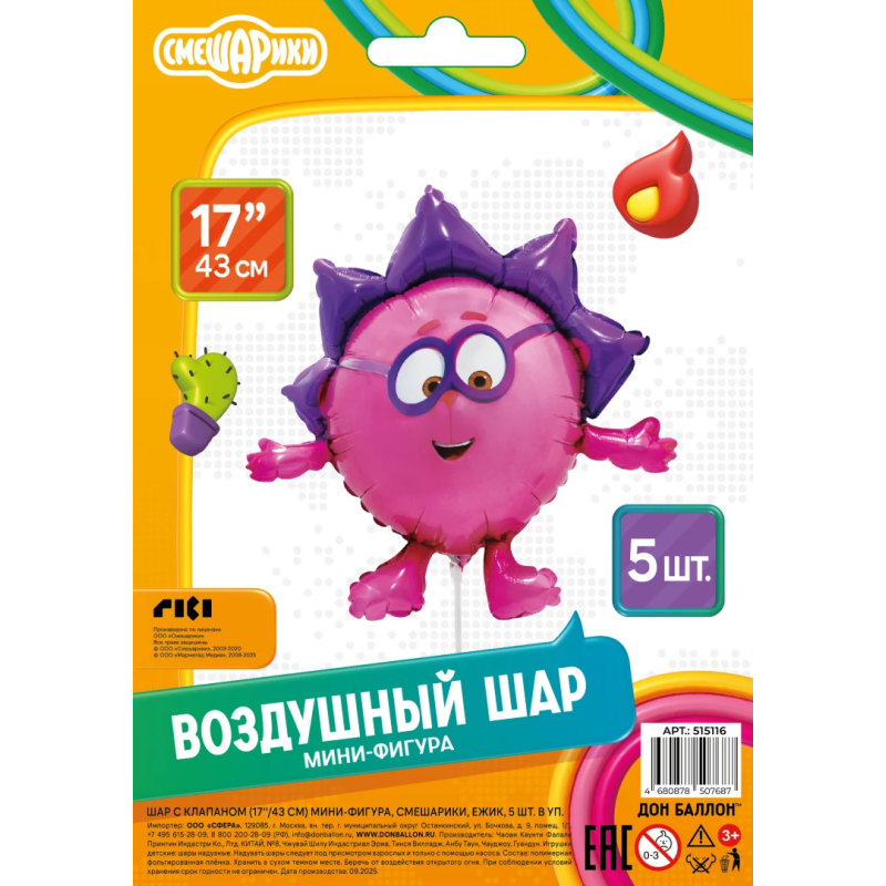 Шар с клапаном (17''/43 см) Мини-фигура, Смешарики, Ежик, 5 шт. в уп., 515116