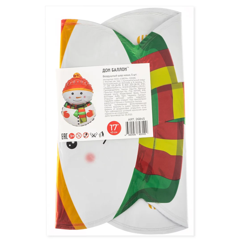 Шар с клапаном (17''/43 см) Мини-фигура, Снеговик в шапочке, 5 шт. в уп., 26845