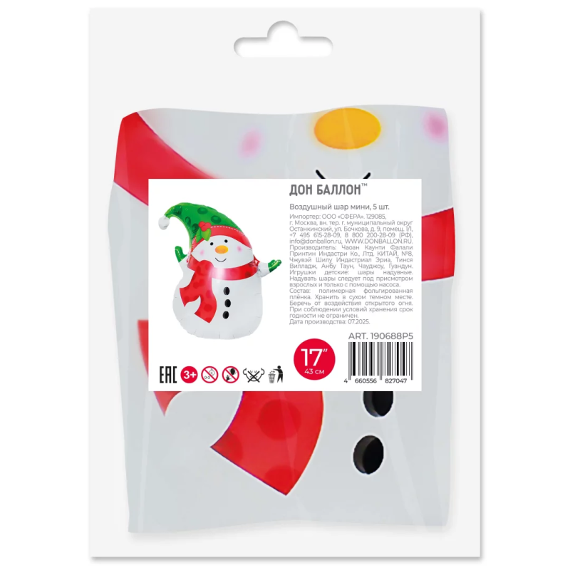 Шар с клапаном (17''/43 см) Мини-фигура, Снеговик в зеленом колпачке, 5 шт. в уп., 190688P5