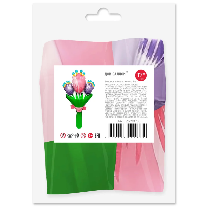 Шар с клапаном (17''/43 см) Мини-фигура, Тюльпаны, 5 шт. в уп. (цв.этик.), 26780S5