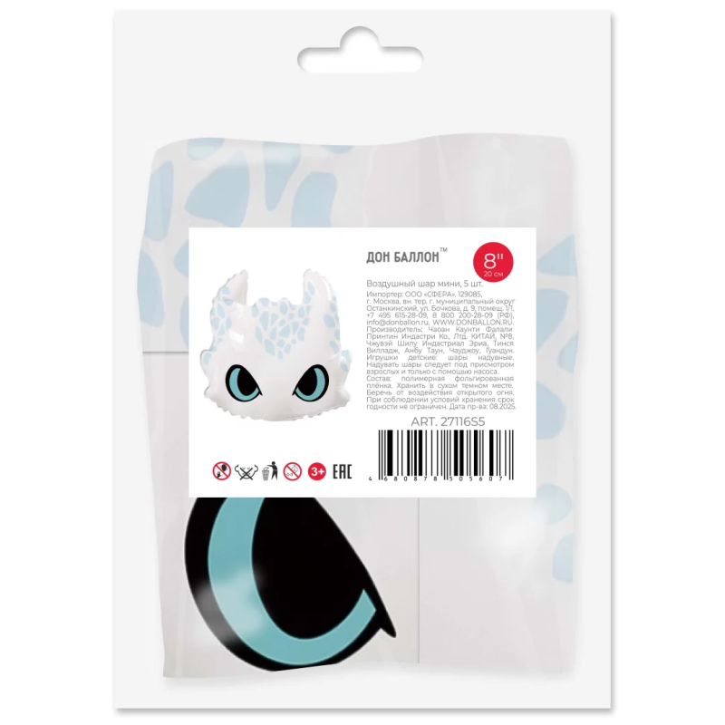 Шар с клапаном (8''/20 см) Мини-фигура, Любимый Дракон, Белый, 5 шт. в уп. (цв.этик.), 27116S5