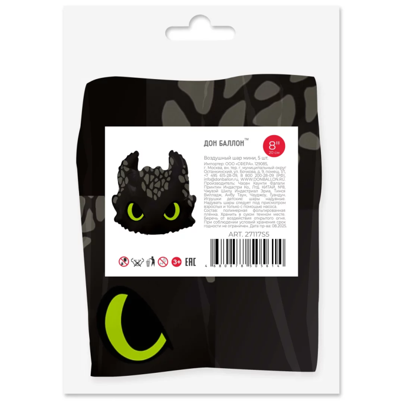 Шар с клапаном (8''/20 см) Мини-фигура, Любимый Дракон, Черный, 5 шт. в уп. (цв.этик.), 27117S5