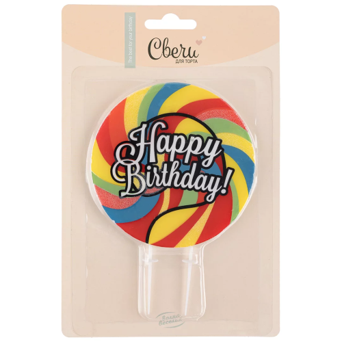 Свеча Круг, Леденец, С Днем Рождения!, Радужный, 10 см, 1 шт. с держат., 132472
