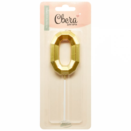 Свеча Цифра, 0 Объемные грани, на шпажке, Золото, Металлик, 4,5*7 + 7 см, 1 шт. с держат., 803060