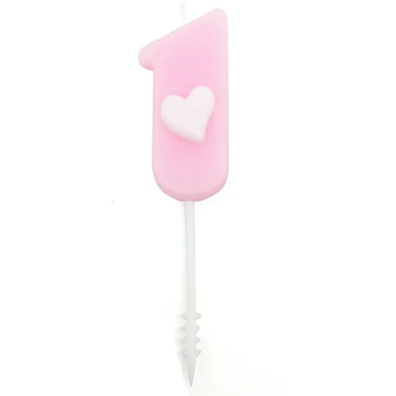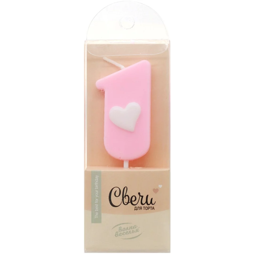 Свеча Цифра, 1 Белое сердечко, на шпажке, Розовый, 4,5 + 4 см, 1 шт. с держат., 802831