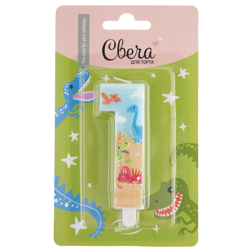 Свеча Цифра, 1 Динозаврики, 9 см, 1 шт. с держат., 622991