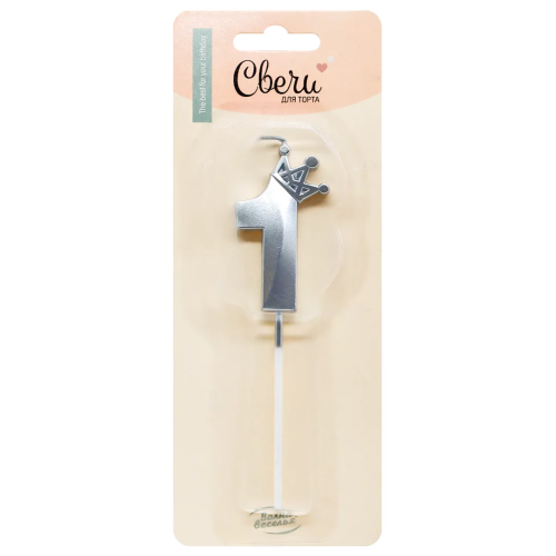 Свеча Цифра, 1 Корона, на шпажке, Серебро, Металлик, 4,5*6 + 6,5 см, 1 шт. с держат., 803051