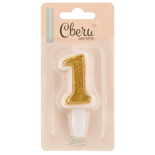 Свеча Цифра, 1, Золото, с блестками, 5 см, 1 шт. с держат., 130111