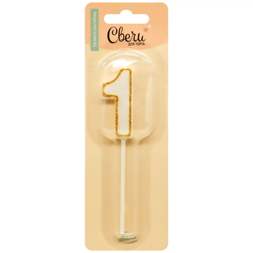 Свеча Цифра, 1 Золотой кант, на шпажке, Белый, с блестками, 4,5*5 + 7 см, 1 шт. с держат., 803081