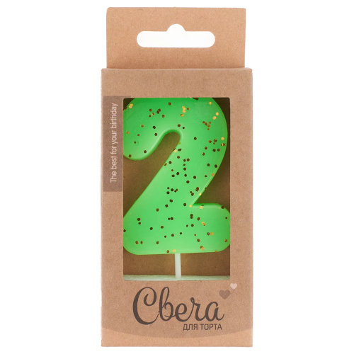 Свеча Цифра, 2 ЭКО, Неон, Зеленый, с блестками, 4*6 + 3 см, 1 шт. с держат., 803222