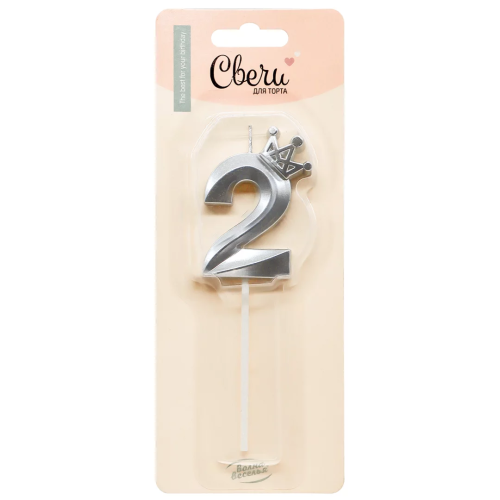 Свеча Цифра, 2 Корона, на шпажке, Серебро, Металлик, 4,5*6 + 6,5 см, 1 шт. с держат., 803052