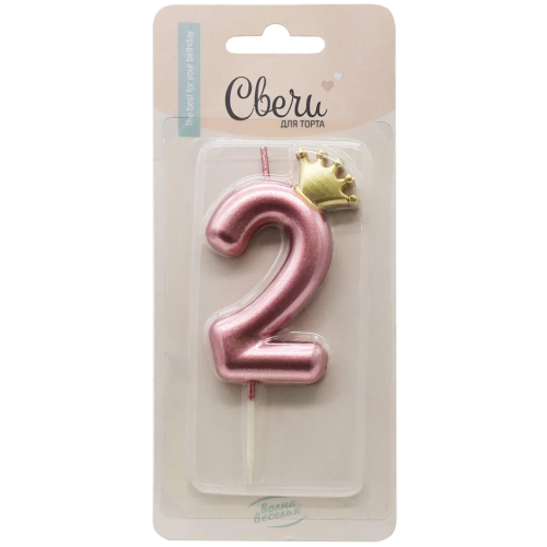 Свеча Цифра, 2 Золотая корона, на шпажке, Розовый, Металлик, 4,5*7 + 3,5 см, 1 шт. с держат., 802812