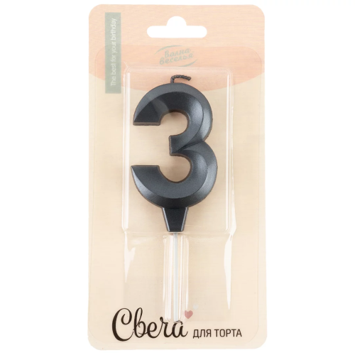 Свеча Цифра, 3 Грани, на шпажке, Мокрый асфальт, Металлик, 3,5*6,5 + 3,5 см, 1 шт. с держат., 3023
