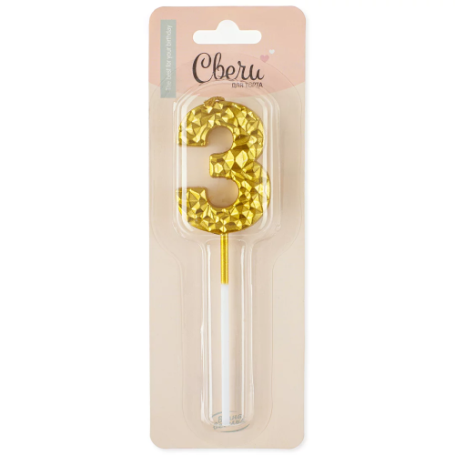 Свеча Цифра, 3 Кристалл, Золото, Металлик, 3,5*4,5 + 7 см, 1 шт. с держат., 802993