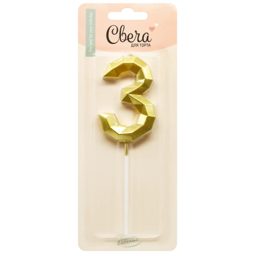 Свеча Цифра, 3 Объемные грани, на шпажке, Золото, Металлик, 4,5*7 + 7 см, 1 шт. с держат., 803063