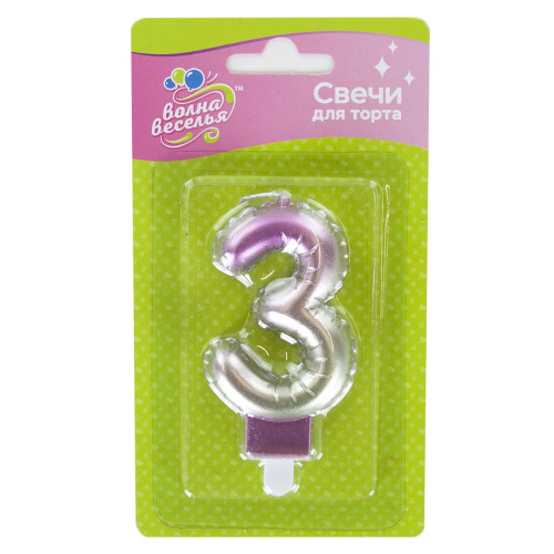 Свеча Цифра, 3, Розовый, Градиент, 7,5 см, 1 шт. с держат., 622973