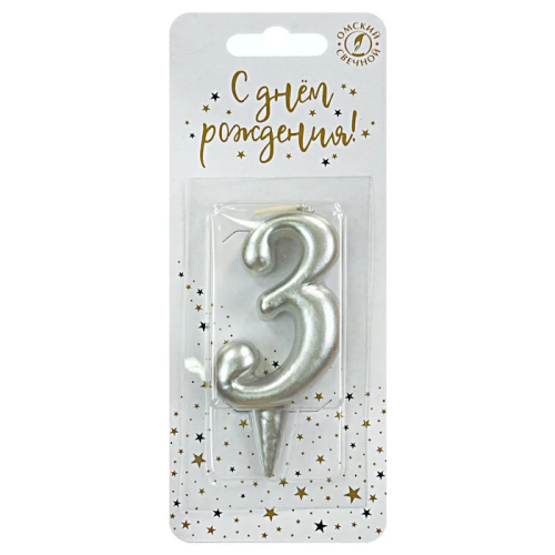 Свеча Цифра, 3, Серебро, 6 см, 1 шт., 3133