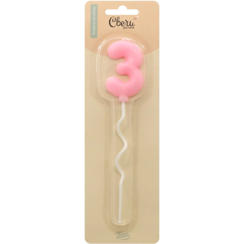 Свеча Цифра, 3 Воздушная серия, Розовый, 6 + 11 см, 1 шт. с держат., 802893