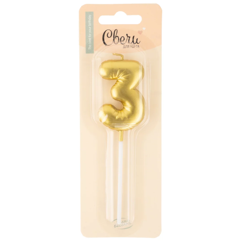 Свеча Цифра, 3 Воздушный шарик, на шпажке, Золото, Металлик, 5,5 см, 1 шт. с держат., 803253