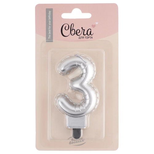 Свеча Цифра, 3 Воздушный шарик, Серебро, Металлик, 5*7 + 1 см, 1 шт. с держат., 623953