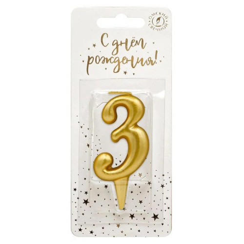 Свеча Цифра, 3, Золото, 6 см, 1 шт., 3083