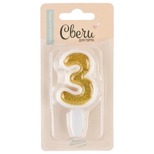 Свеча Цифра, 3, Золото, с блестками, 5 см, 1 шт. с держат., 130113