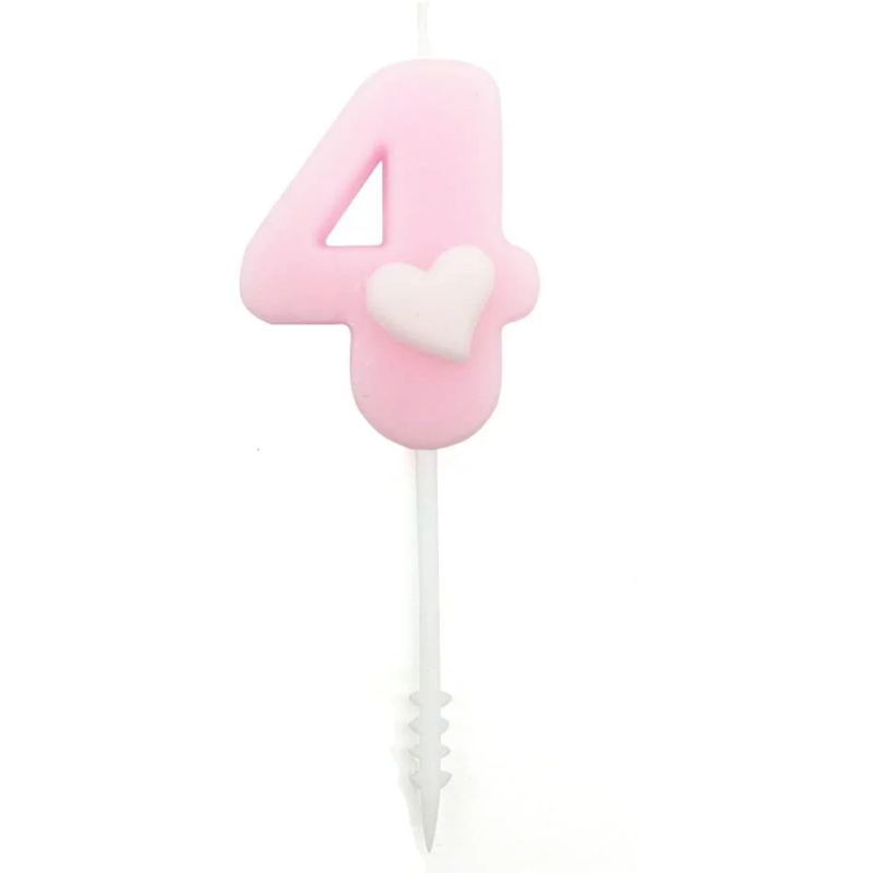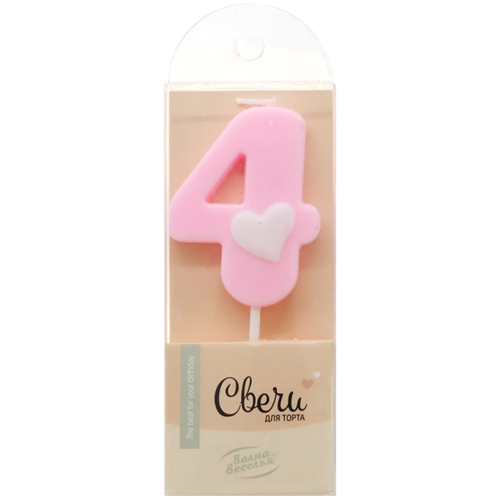 Свеча Цифра, 4 Белое сердечко, на шпажке, Розовый, 4,5 + 4 см, 1 шт. с держат., 802834