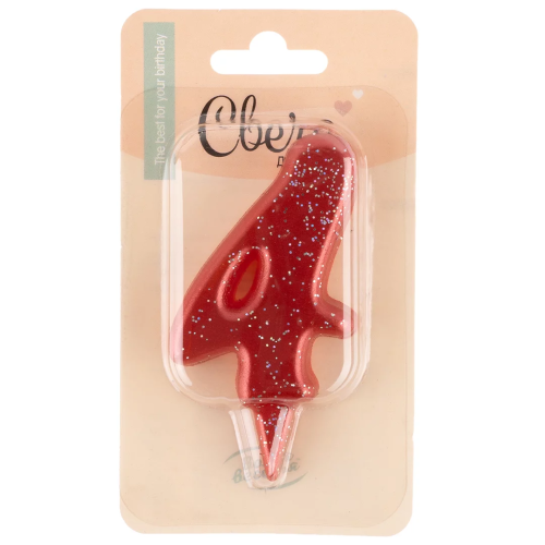 Свеча Цифра, 4 Овал, Красный, с блестками, 4*8 см, 1 шт., 1490