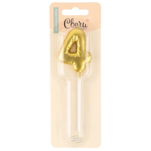 Свеча Цифра, 4 Воздушный шарик, на шпажке, Золото, Металлик, 5,5 см, 1 шт. с держат., 803254