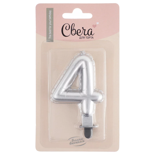 Свеча Цифра, 4 Воздушный шарик, Серебро, Металлик, 5*7 + 1 см, 1 шт. с держат., 623954