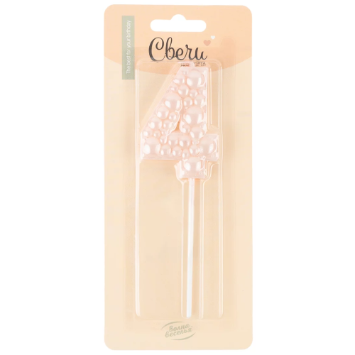 Свеча Цифра, 4 Воздушный жемчуг, на шпажке, Нежно-розовый, Перламутр, 6 см, 1 шт. с держат., 803244