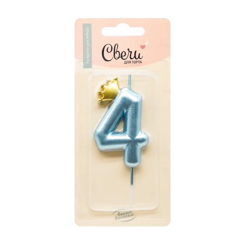 Свеча Цифра, 4 Золотая корона, на шпажке, Голубой, Металлик, 4,5*7 + 3,5 см, 1 шт. с держат., 803044