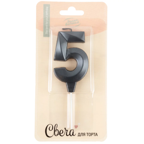 Свеча Цифра, 5 Грани, на шпажке, Мокрый асфальт, Металлик, 3,5*6,5 + 3,5 см, 1 шт. с держат., 3025