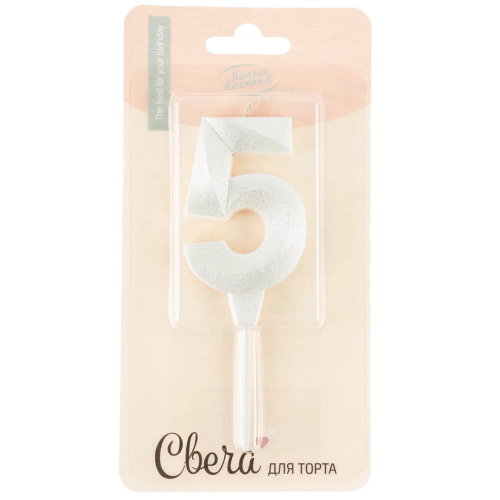 Свеча Цифра, 5 Грани, на шпажке, Жемчужный, Перламутр, 3,5*6,5 + 3,5 см, 1 шт. с держат., 3045