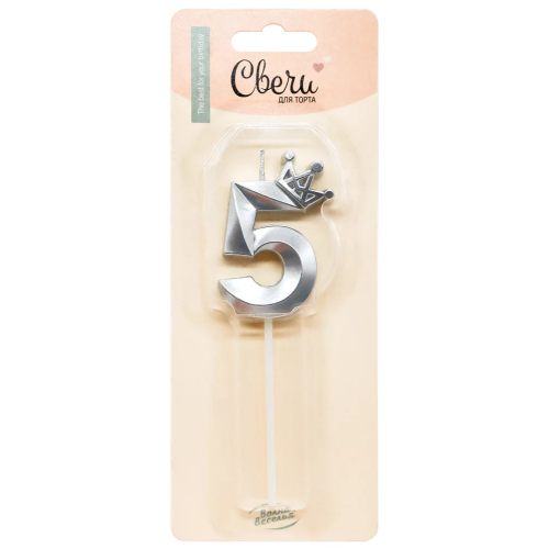 Свеча Цифра, 5 Корона, на шпажке, Серебро, Металлик, 4,5*6 + 6,5 см, 1 шт. с держат., 803055