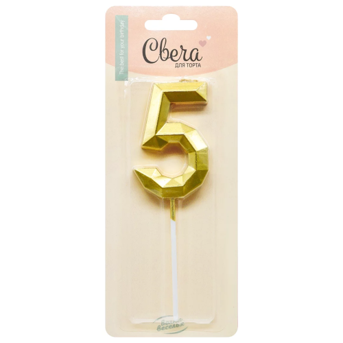 Свеча Цифра, 5 Объемные грани, на шпажке, Золото, Металлик, 4,5*7 + 7 см, 1 шт. с держат., 803065