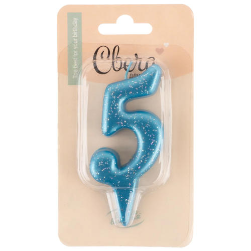 Свеча Цифра, 5 Овал, Синий, с блестками, 4*8 см, 1 шт., 1501