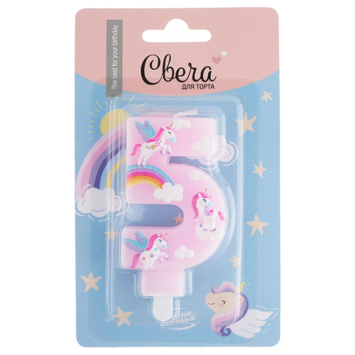 Свеча Цифра, 5 Волшебные единороги, Розовый, 9 см, 1 шт. с держат., 622985