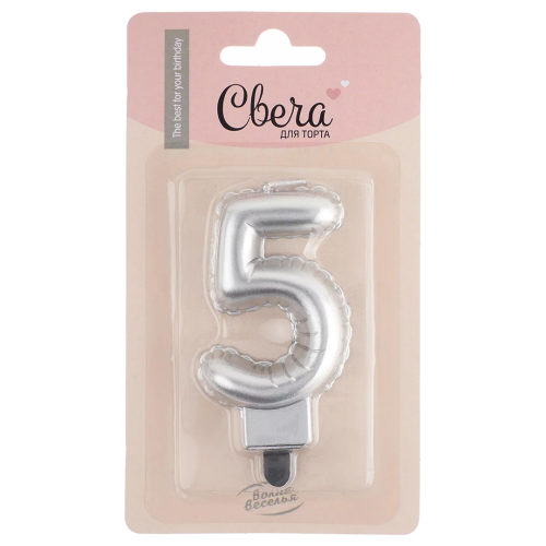 Свеча Цифра, 5 Воздушный шарик, Серебро, Металлик, 5*7 + 1 см, 1 шт. с держат., 623955