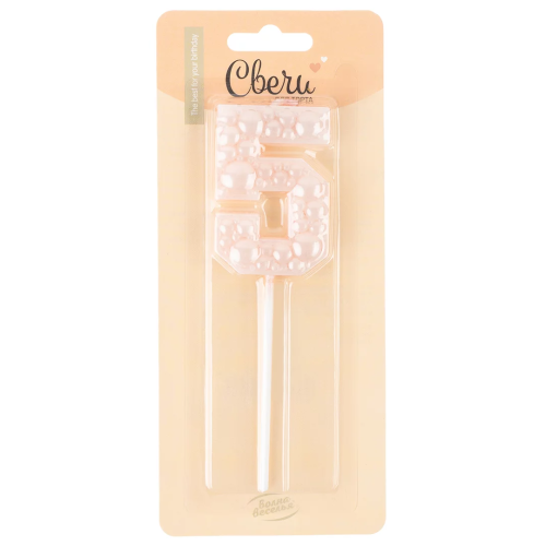 Свеча Цифра, 5 Воздушный жемчуг, на шпажке, Нежно-розовый, Перламутр, 6 см, 1 шт. с держат., 803245