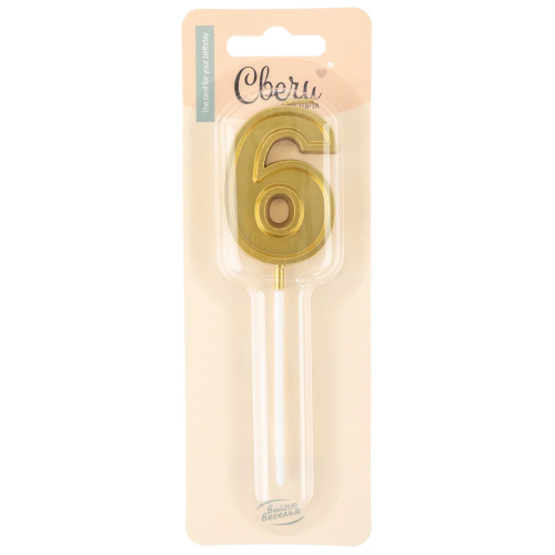 Свеча Цифра, 6 Чистая линия, на шпажке, Золото, 4,7*6,7 + 7 см, 1 шт. с держат., 803276