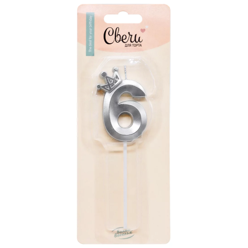 Свеча Цифра, 6 Корона, на шпажке, Серебро, Металлик, 4,5*6 + 6,5 см, 1 шт. с держат., 803056
