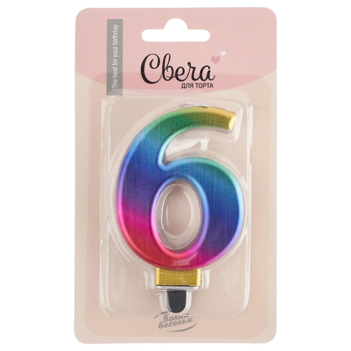Свеча Цифра, 6, Радужный, Градиент, 8 см, 1 шт. с держат., 622076