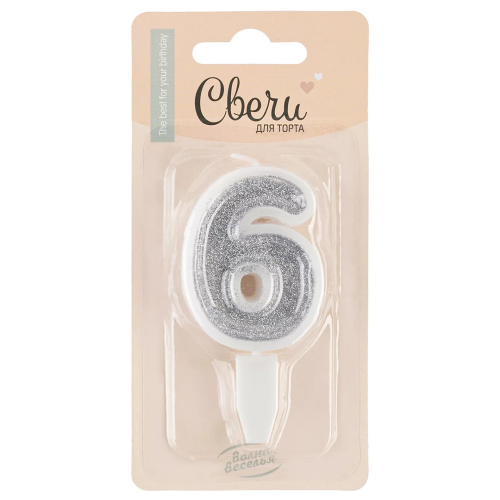 Свеча Цифра, 6, Серебро, с блестками, 5 см, 1 шт. с держат., 130126