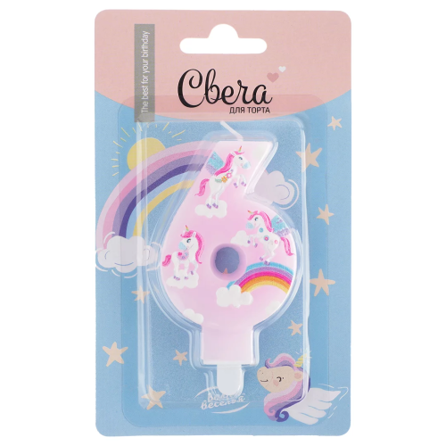 Свеча Цифра, 6 Волшебные единороги, Розовый, 9 см, 1 шт. с держат., 622986