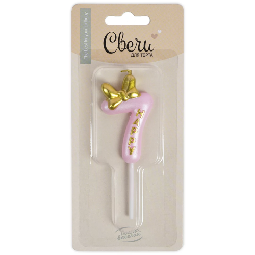 Свеча Цифра, 7 Золотой бант, на шпажке, Розовый, Металлик, 3,4*5,7 + 4 см, 1 шт. с держат., 802827